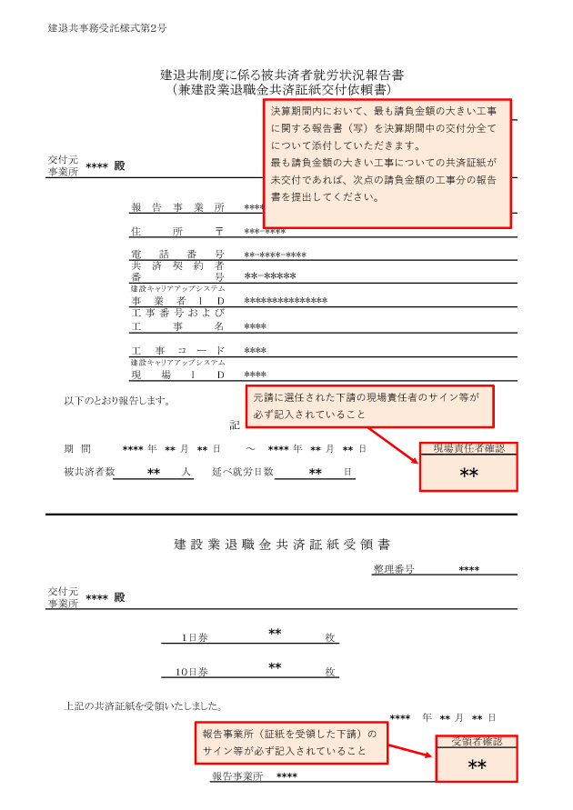 決算期間内で最も請負代金の大きい工事の「建退共制度に係る被共済者就労状況報告書(建設業退職金共済証紙受領書を含む)」により、下請からの依頼に対して適正枚数の共済証紙を交付し、下請の受領が確認できること。