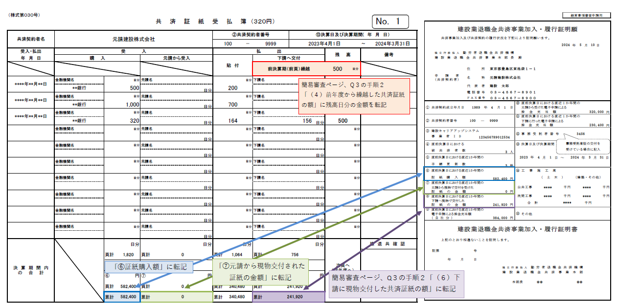 共済証紙購入額等:共済証紙受払簿、掛金収納書等で確認